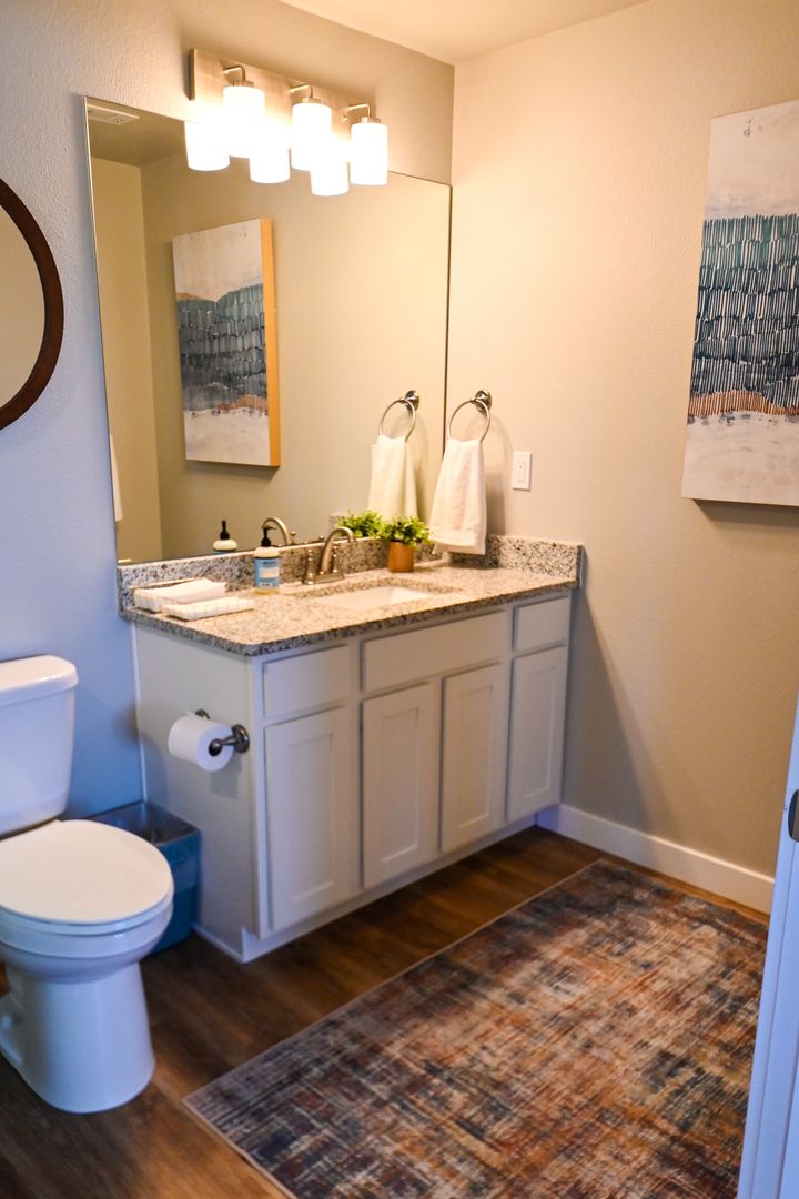 Step inside the Amber unit, a 1 bedroom, 1 bathroom single story modern concept living space with beautiful hardwood-style flooring throughout. The stylish kitchen has a stainless steel farmhouse sink, granite countertops, solid wood cabinets and an abundance of natural light flooding the space. The built-in shelves and large closets offer ample room for your belongings, keeping your home organized and clutter free.