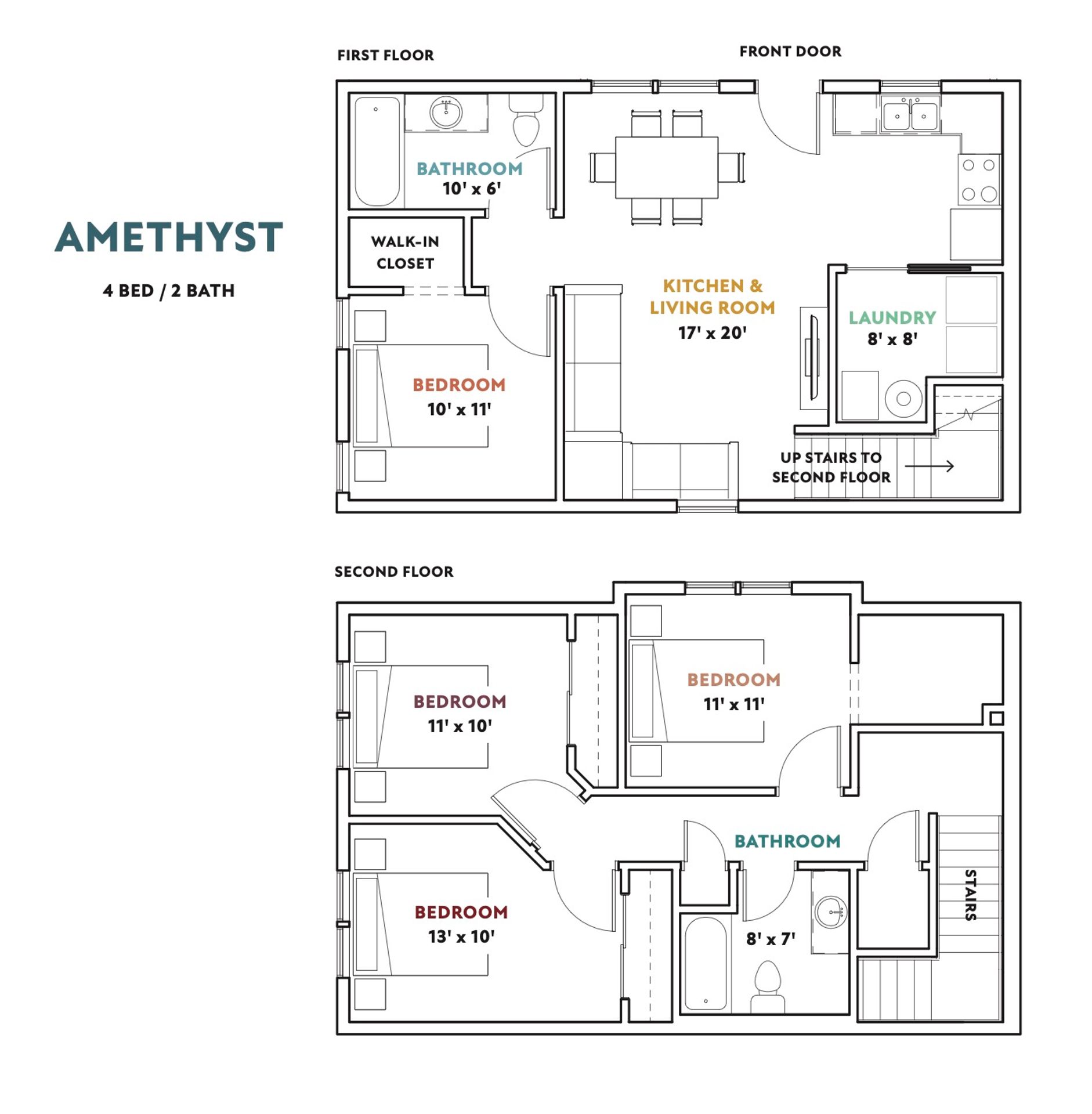 Step inside the Amethyst unit, a 4 bedroom, 2 bathroom two-story modern concept living space with beautiful hardwood-style flooring throughout. The main level has a stylish kitchen with a stainless steel farmhouse sink, granite countertops, solid wood cabinets, and an abundance of natural light flooding the space. Convenience is key with main floor washer and dryer, bedroom and bathroom with large closets to offer ample room for your belongings, keeping your home organized and clutter free. Head up stairs to the 2nd floor that includes 3 bedrooms and a full bath. Sit outside on your private front porch for some fresh air or mountain views depending on unit location.