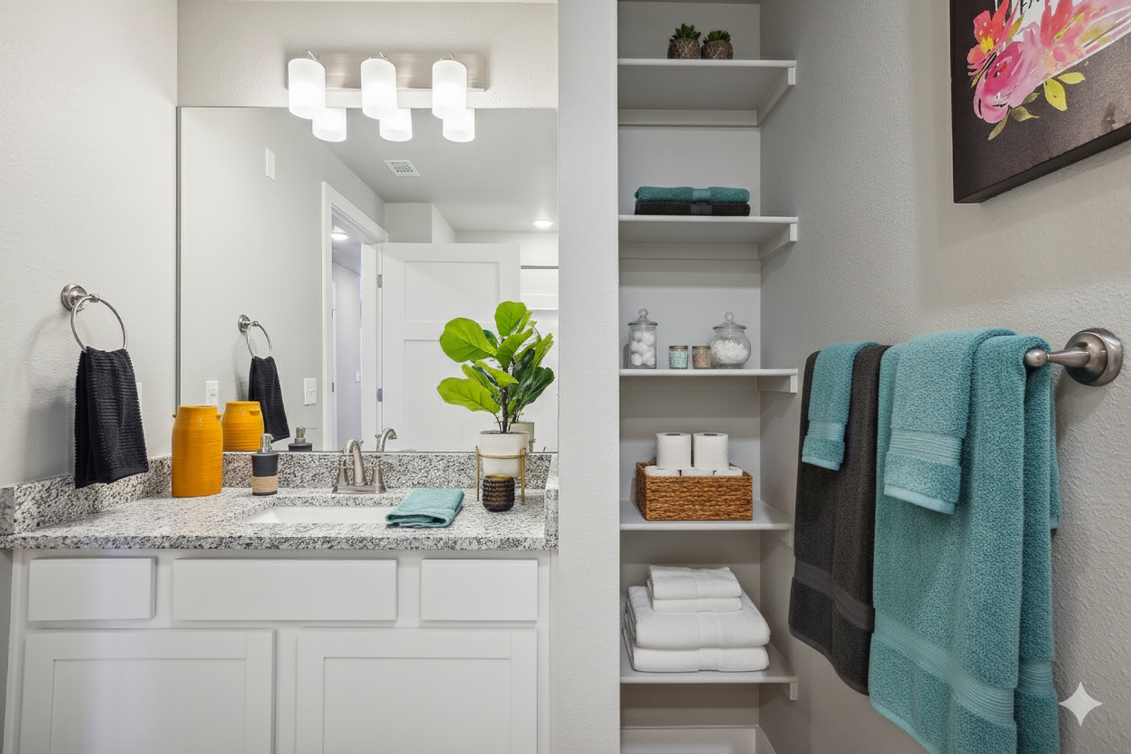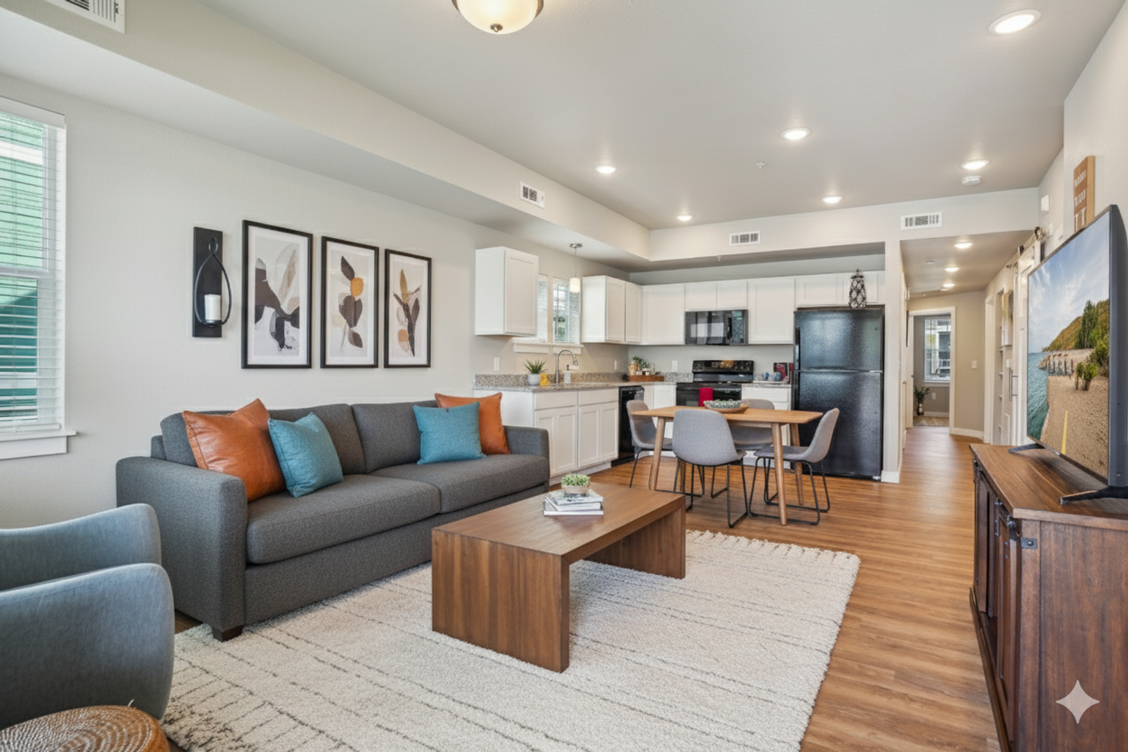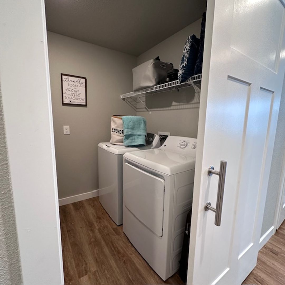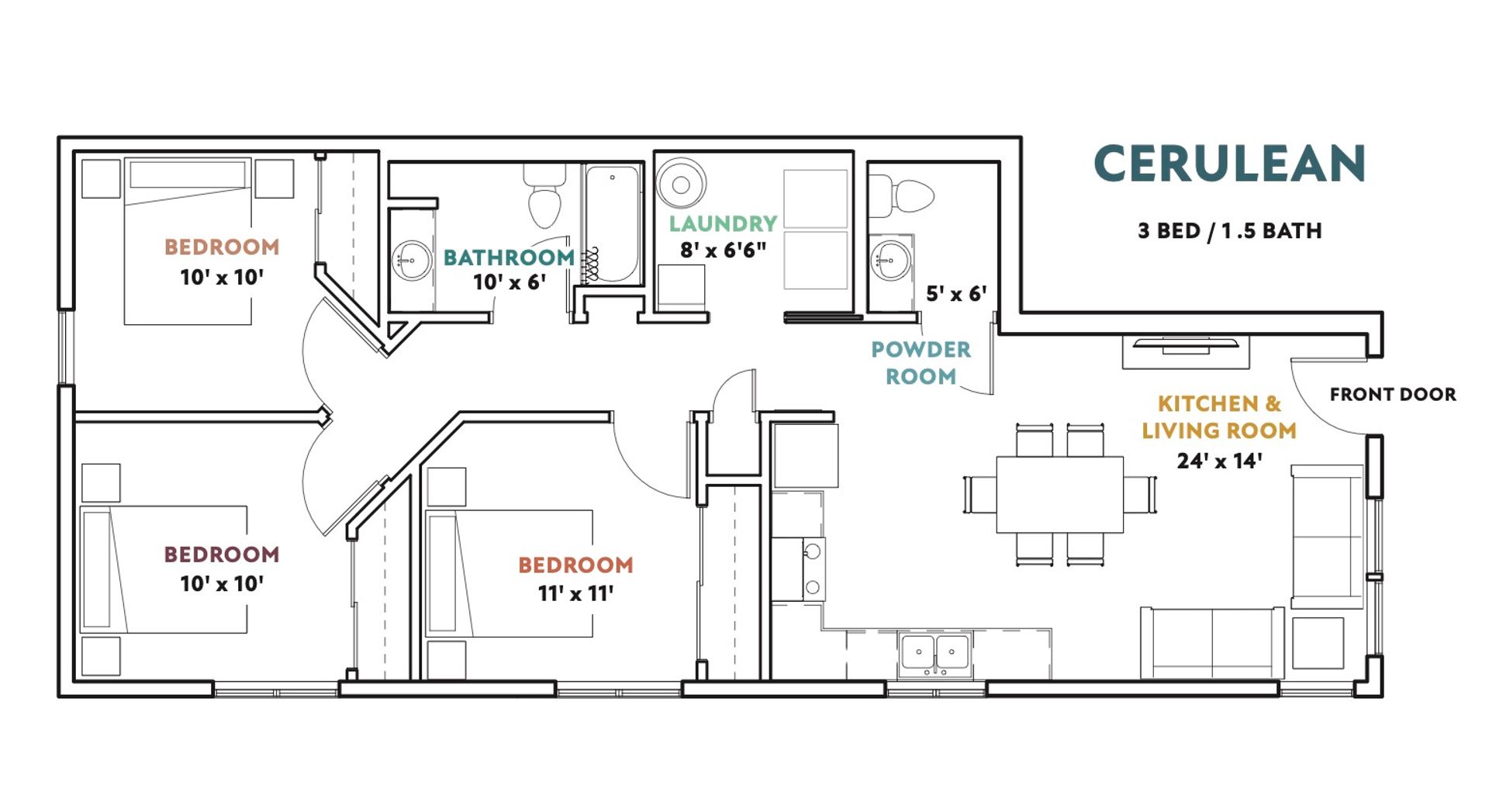 Step inside the Cerulean floor plan, a 3 bedroom, 1 1/2 bathroom single level end unit apartment with beautiful hardwood styling throughout. The stylish kitchen has a stainless steel farmhouse sink, granite countertops, solid wood cabinets and an abundance of natural light flooding the space. The built-in shelves and large closets offer ample room for your belongings, keeping your home organized and clutter free.